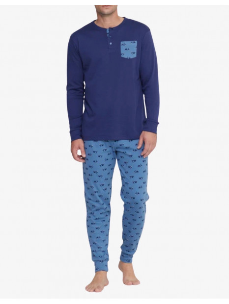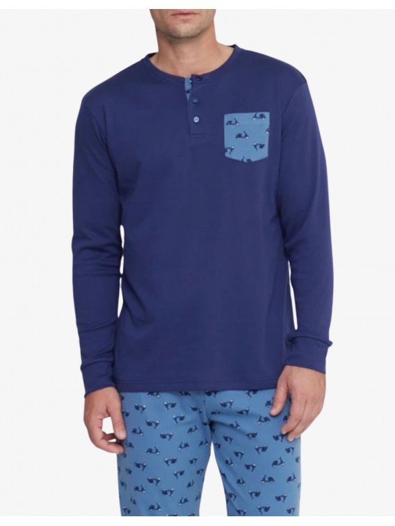 Pigiama serafino in caldo cotone con polsino morbido alle maniche ed ai pantaloni. Taschino sulla maglia e coulisse ai pantaloni.
